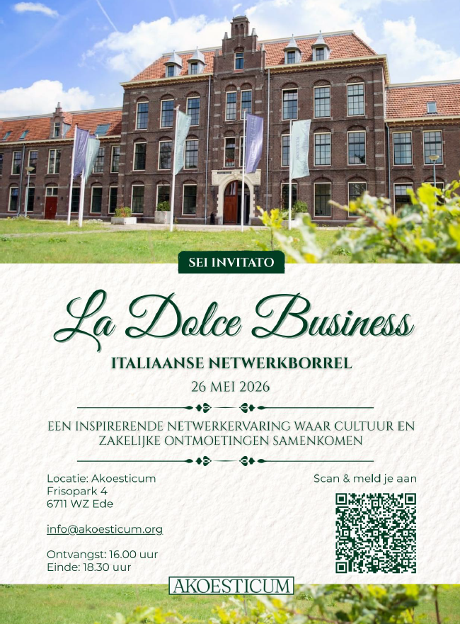 Op 26 mei 2026 organiseert Akoesticum in Ede het netwerkevent La Dolce Business. Een inspirerende bijeenkomst waarin wordt ingezoomd op de vraag hoe je meer impact en beleving creëert binnen zakelijke bijeenkomsten.