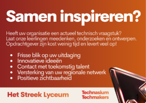Een aantal leerlingen en een docent van Het Streek Lyceum (Technasium & Techmakers) vertellen hoe zij werken met realistische, technische vraagstukken vanuit het bedrijfsleven. Zij zijn op zoek naar actuele uitdagingen uit de praktijk waarmee leerlingen creatief en onderzoekend aan de slag kunnen.